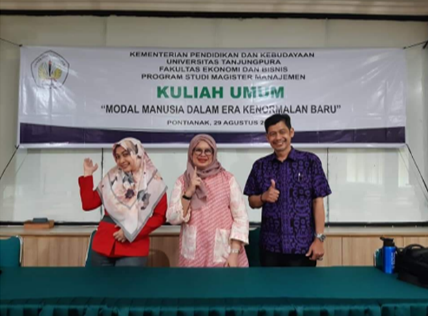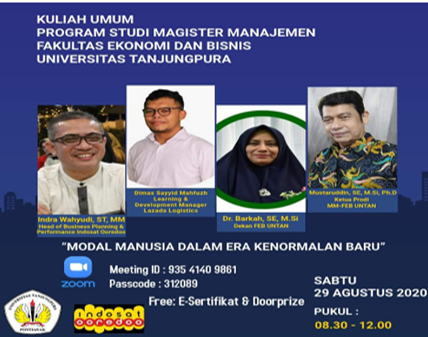 Tema Kuliah Umum Tahun akademik 2020/2021 adalah “Modal Manusia dalam Era ke Normalan Baru”. Kegiatan ini dilaksanakan pada Tanggal 29 Agustus 2020 melalui Zoom Meeting. Terdapat dua Pemateri dalam kuliah Umum yaitu Dimas Sayyid Mahfudz Learning & Development Manager Lazada Logistic dan Indra Wahyudi, ST., MM (Alumni PS-MM FEB UNTAN) sebagai Head of Business Planning & Performance Indosat Ooredo. Peserta dalam kuliah umum adalah Mahasiswa Baru dan Mahasiswa semester 2 dan 3 serta Dosen PS-MM FEB UNTAN.