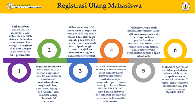 - Mahasiswa berkewajiban melaksanakan regitrasi ulang untuk memperoleh status terdaftar dan memperoleh hak mengikuti kegiatan akademik satu semester yang akan berjalan degnan membayar biaya SPP persemester.